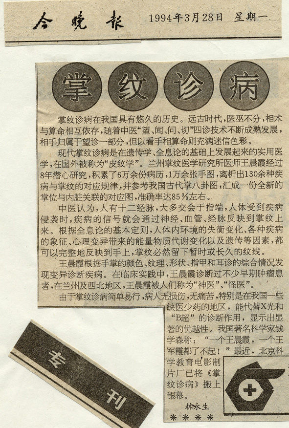 · 1994年2月25日《消费报》刊登“掌纹神医义务就诊”